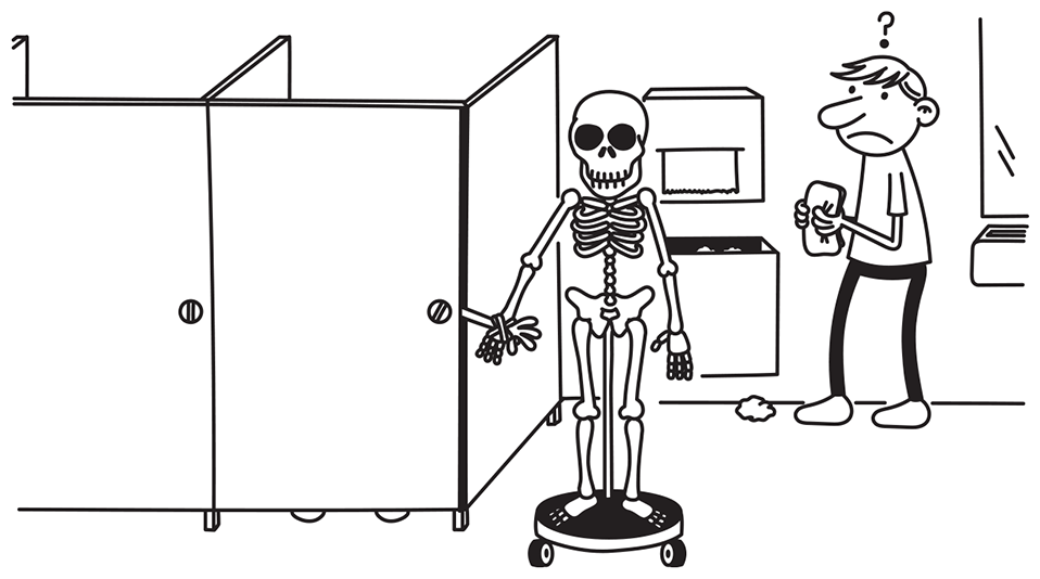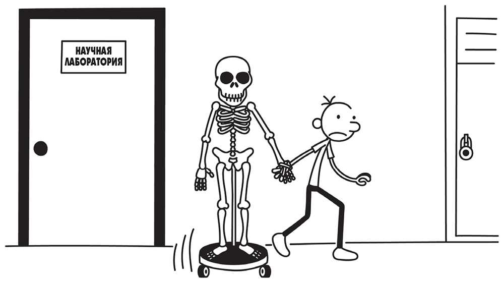 Пропуск мистера Раска – учебный анатомический скелет, который надо привязывать к руке резинкой.