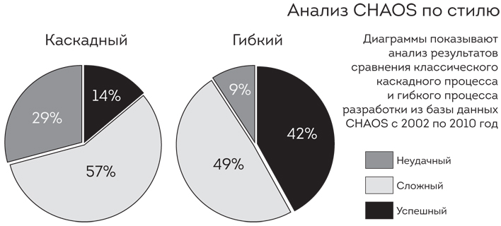 Используя график Стейси, можно увидеть, что проекты по разработке программного обеспечения как минимум сложные, а иногда и хаотичные. Предиктивный процесс, на котором основаны каскадный и традиционный методы девелопмента софта, пригоден только для простой, повторяющейся работы. Вы можете определить, правильный ли процесс вы используете, по ставке доходности, степени успеха. Если бы предиктивный подход был подходящим для проектов разработки программного обеспечения, ставка доходности (или процент успешного завершения проектов) была бы очень высокой – около 99,99 %. Однако рассмотренный ранее отчет The Standish Group оценивает процент успеха проектов разработки программного обеспечения, использовавших предиктивный метод, в 14 %.