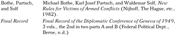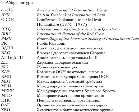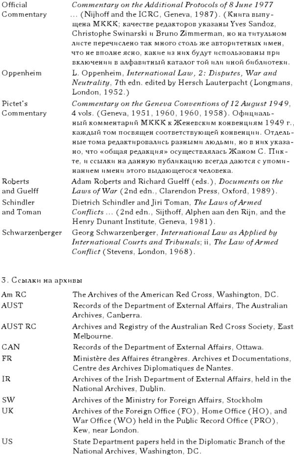 Международный Комитет Красного Креста через посредство высоких должностных лиц и сотрудников оказывал самую широкую поддержку и содействие с тех самых пор, как двадцать три года назад я удостоился чести быть представленным Комитету Пьером Буасье. Мое восхищение работой Комитета так же искренне, как и отношение к тем членам его персонала, с которыми мне больше всего довелось встречаться. И если в последние годы я меньше привлекал их к работе, чем раньше, то это в большой степени из-за опасений, что чрезмерная зависимость от них и их замечательной организации может стеснить свободу моего суждения или создать неверное впечатление о том, что я написал некоторым образом конформистскую книгу. Не все мной написанное совпадает с тем, что я, верно или ошибочно, воспринимаю как ортодоксия ICRC, однако ничего из того, что я написал, не предназначено или на деле способно принизить то уникальное место, которое ICRC занимает в мировом порядке гуманитарных явлений. Полагаю, что читатели без труда поймут, что углубленное изучение Международного гуманитарного права только укрепило мое ощущение крайней важности этой отрасли права и повысило уважение к замечательной организации, которая, можно сказать, опекает его.