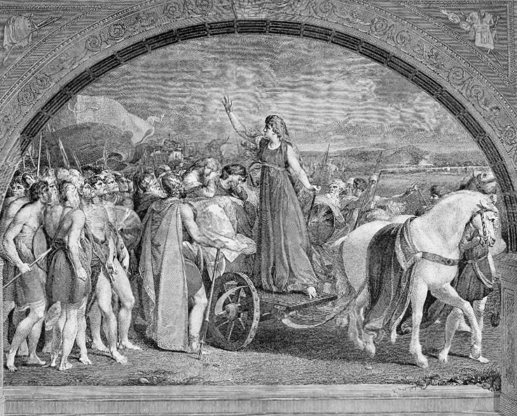 Восстание, поднятое в 61 году вдовствующей царицей кельтского племени иценов Боудиккой, началось в удачно выбранный момент – римский наместник Гай Светоний Паулин отправился усмирять непокорных бриттов, укрепившихся на острове Мона (ныне Англси)[12]. Вдобавок к Боудикке присоединились соседние кельтские племена, в первую очередь – тринованты, жившие на территории современного Эссекса[13]. Мнения историков сильно разнятся, но, согласно наиболее достоверной версии, Боудикка вела за собой около ста тысяч воинов.