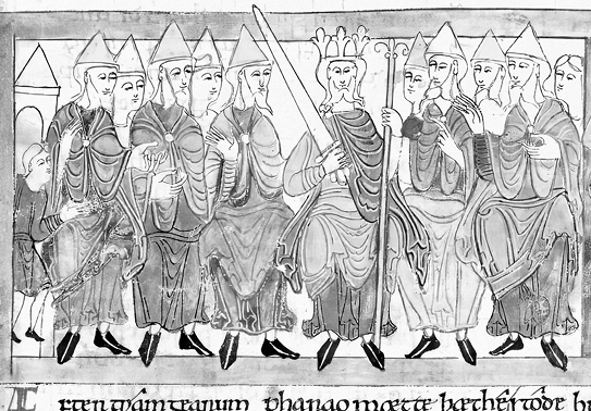 Англосаксонский монарх в окружении своих советников. Миниатюра из рукописи «Шестикнижия». XI век