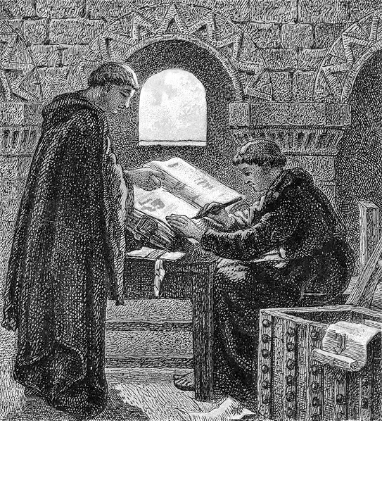 Монахи пишут Книгу страшного суда. Иллюстрация XIX век