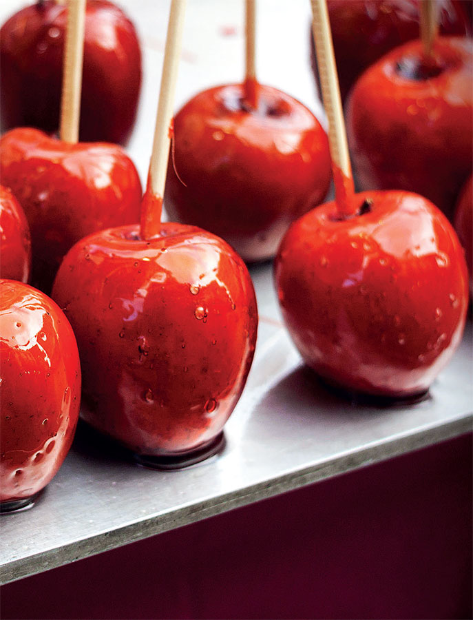 6. Палочку с яблоком и окуните в теплую карамель. Покрутите, чтобы карамель распределилась по всей поверхности яблока.