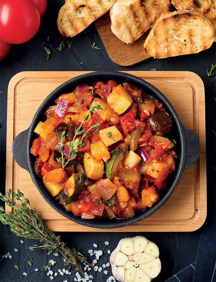 5. Очистите и мелко нарежьте перец. Добавьте его к помидорам и оставьте получившуюся смесь тушиться еще немного, чтобы испарилось больше воды. Можно немного подсолить и поперчить по вкусу.