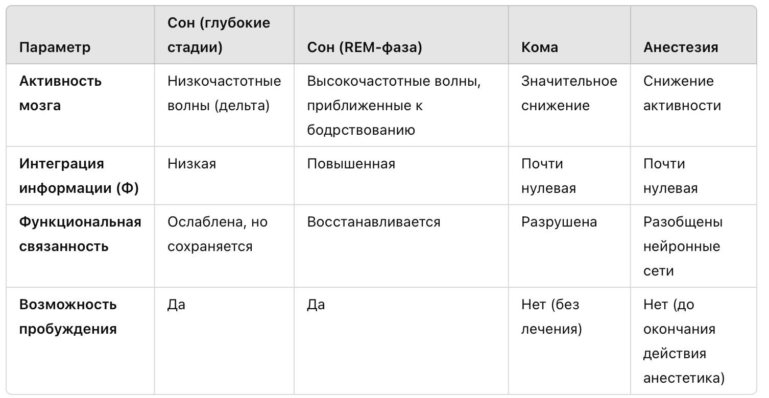 Кома и состояние, вызванное общей анестезией, представляют собой радикальные нарушения сознания, при которых интеграция информации в мозге практически прекращается. В отличие от сна, где возможны переходы между фазами и пробуждение, при коме или глубоком наркозе нейронные связи теряют способность к глобальной координации, что ведет к полной утрате субъективного опыта.
