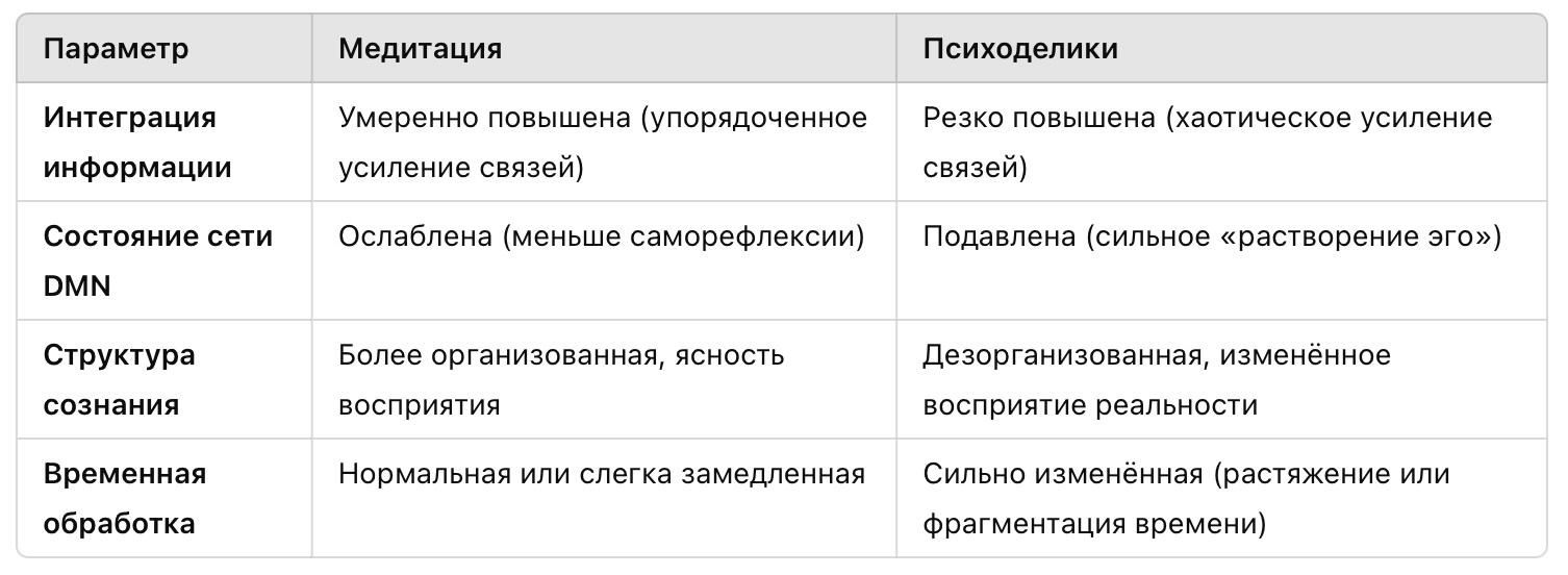 Медитация и психоделики изменяют состояние сознания разными путями. Медитация ведёт к более упорядоченному состоянию сознания, в котором усиливаются полезные нейронные связи, а саморефлексия ослабляется. Влияние психоделиков, напротив, приводит к хаотическим перестройкам в мозге, создавая необычные ощущения, такие как синестезия, нарушение чувства времени и растворение эго. Оба состояния связаны с изменениями в интеграции информации, что подтверждает их связь с работой мозга на глубоком уровне.