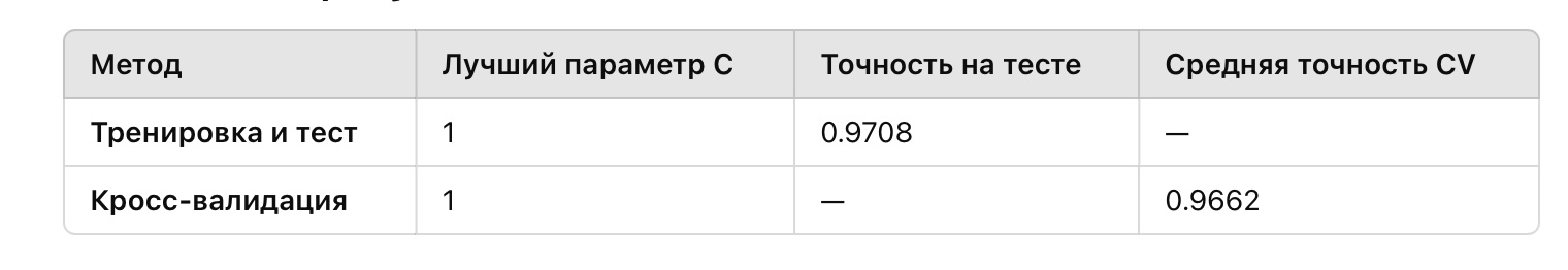 – Тренировка и тест: Мы видим, что лучший результат на тестовых данных даёт ( C = 1 ), с точностью 0.9708. Однако это значение точности зависит от того, как именно разделены данные на тренировочную и тестовую выборки. Если бы разделение было другим, результат мог бы измениться.