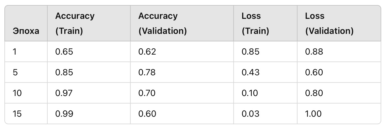На 10-й эпохе точность на обучающем наборе (97%) значительно выше, чем на валидационном (70%). Это указывает на то, что модель "запомнила" обучающие данные, но не может обобщить знания для новых примеров.