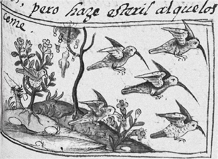 Рис. 1. Иллюстрация к описанию колибри из «Флорентийского кодекса» (1578). Обратите внимание на колибри, висящих на дереве в состоянии «оцепенения»