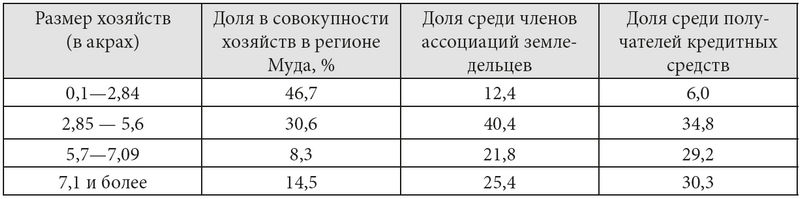 Таблица 3.7. Соотношение между распределением размеров хозяйств, членством в земледельческих ассоциациях и получателями кредитов на производственные цели