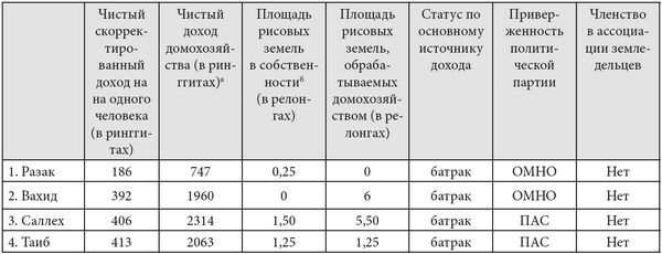 а) Сведения о чистом доходе домохозяйств неизбежно содержат тот или иной компонент, точность которого не гарантирована. Поступления от выращивания риса – основная составляющая доходов большинства домохозяйств – могут быть рассчитаны с той или иной точностью. Однако калькуляция доходов от наемного труда и побочных работ несколько менее точна, хотя мною были предприняты усилия по двойной проверке таких цифр. Таким образом, показатели чистого дохода домохозяйств следует считать обоснованными приблизительными цифрами, почти во всех случаях рассчитанными с точностью в пределах 200–300 ринггитов. В связи с этим наличие безупречно точных данных может изменить порядок ранжирования лишь незначительно.
