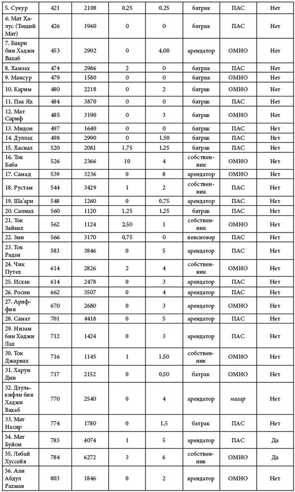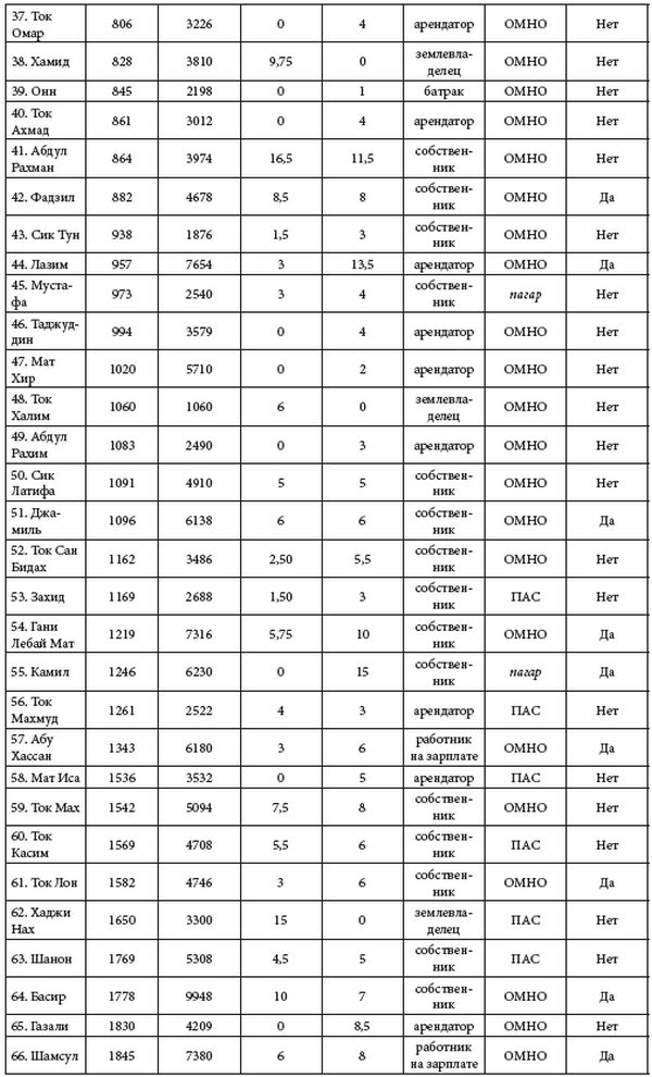 В 1978–1979 годах, когда я находился в Седаке, распределение доходов здесь было чрезвычайно непропорциональным. Несмотря на отсутствие сопоставимых данных на 1967 год, всё, что нам известно о распределении земель и размеров хозяйств, свидетельствует о присутствии неравенства как минимум в тех же масштабах. О текущей ситуации можно судить по Таблице 4.1, в которой приводятся суммы чистых доходов каждого домохозяйства в деревне, а также данные о рисовых землях, принадлежащих главам всех домохозяйств и эксплуатируемых ими, и их основных занятиях. Семьи в таблице расположены от самых бедных к самым богатым на основании дохода на одного члена домохозяйства. Обращение к этому списку может пойти на пользу, если у читателя возникнет необходимость в установлении доходов, статуса землепользования, основного источника поступлений домохозяйства, партийной принадлежности и прочих характеристик семей, которые будут постоянно упоминаться в дальнейшем тексте.