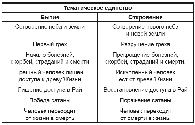 Единство БиблииСюжетная линия. Самое общее представление о единстве Библии можно получить, сравнив первые главы первой книги Библии (Бытие) и последние главы последней книги (Откровения). Сравнение первых и последних глав Библии приведено в следующей таблице.