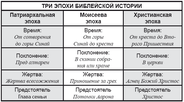Ожидания со стороны Бога в каждую из названных эпох отличались. Каждая имела свои факты, в которые следовало верить, свои заповеди, которые следовало исполнять, свои предупреждения, которые следовало принимать во внимание, и свои обещания, исполнение которых следовало ожидать. То, что Бог требовал и что разрешал в эпоху патриархов, не обязательно допускалось или требовалось в эпоху Моисея. Поэтому, например, христианам не обязательно следовать всем 613 заповедям, записанным в Законе Моисея. Способы достижения спасения после смерти Христа отличаются от тех, которые предлагались человеку до явления Иисуса. В Моисееву и христианскую эпохи свет истины сиял ярче, чем в эпоху патриархов. Характер Бога, Его воля и цели стали куда яснее. Таблица указывает на основные различия между тремя эпохами.
