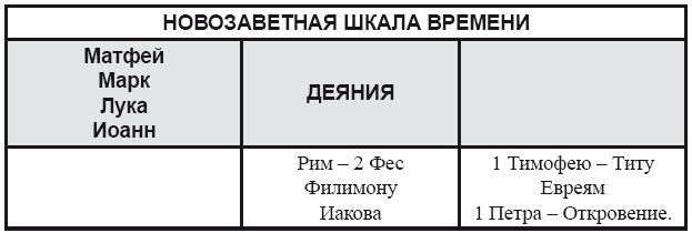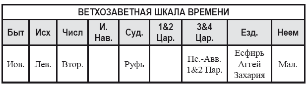 Хронология библейских книг. Библейскую историю можно реконструировать на основе одиннадцати книг Ветхого Завета. Эти книги можно назвать историческими, ибо они строго привязаны к хронологии и описывают ход событий в определенный отрезок библейской истории. Названия книг перечислены во втором ряду двух следующих таблиц. Книги, помещенные в третий ряд таблицы, хотя и относятся к соответствующим временным интервалам, но носят больше тематический характер (то есть они не «привязаны» к историческим событиям, а лишь поднимают различные темы, связанные с историей тех времен).