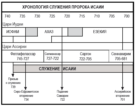 Исаия был призван к пророческому служению в «год смерти царя Озии» (6:1). Согласно вычислениям учёных, это 739 год до н. э. Само служение продолжалось в течение примерно шестидесяти лет и захватило времена правления Иофама, Ахаза и Езекии. Согласно традиции, Исайя умер мученической смертью около 680 года до н. э., в начале правления нечестивого царя Манассии. Легенда гласит, что царь при этом распилил его на части (ср. Евр. 11:37).