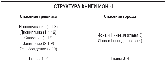 Тема Книги Ионы – забота Бога о погибающих. Книга состоит из двух частей. В первых двух главах Бог спасает грешника; в последних двух главах Он спасает город. Книга была названа «образцом художественного мастерства, отмеченного симметрией и балансом»8. В Таблице № 9 представлена структура Книги Ионы.