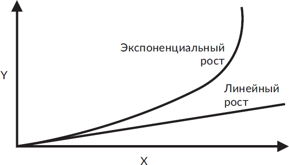 Линейный рост – это прямая линия, тогда как экспоненциальный рост обычно выглядит как восходящая кривая.