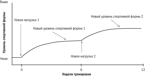 Придерживаясь такого тренировочного режима в течение достаточно длительного времени, спортсмен достигнет определенного уровня формы, который останется стабильным, но будет отличаться от уровня формы, которого он мог бы достичь, если бы его тренировочная программа состояла, например, из пяти пробежек по 1600 метров за 7 минут. На рис. 1.1 показано, как происходит выход на новый уровень формы с течением времени.