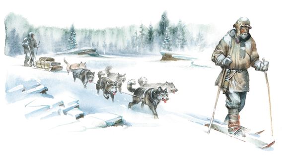 И всё же что-то живое двигалось в ней и бросало ей вызов. По замёрзшей реке пробиралась упряжка ездовых собак. Взъерошенная шерсть их заиндевела на морозе, дыхание застывало в воздухе и кристаллами оседало на шкуре. Собаки были в кожаной упряжи, и кожаные постромки шли от неё к волочившимся сзади саням. Сани без полозьев, из толстой берёзовой коры, всей поверхностью ложились на снег. Передок их был загнут кверху, как свиток, чтобы приминать мягкие снежные волны, встававшие им навстречу. На санях стоял крепко притороченный узкий, продолговатый ящик. Были там и другие вещи: одежда, топор, кофейник, сковорода; но прежде всего бросался в глаза узкий, продолговатый ящик, занимавший бо́льшую часть саней.