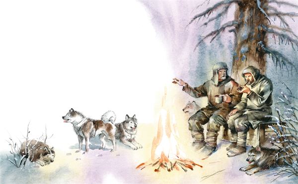 Утром он проснулся первым и разбудил товарища. До рассвета оставалось ещё часа три, хотя было уже шесть часов утра. В темноте Генри занялся приготовлением завтрака, а Билл свернул постель и стал укладывать вещи в сани.