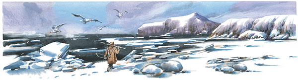 На следующий день он направился вдоль берега, где земля встречается со льдами. Те, кто видел его, заметили, что он взял с собой лук и большой запас стрел с костяными наконечниками, а на плече нёс большое охотничье копьё своего отца. И много было толков и много смеха по этому поводу.