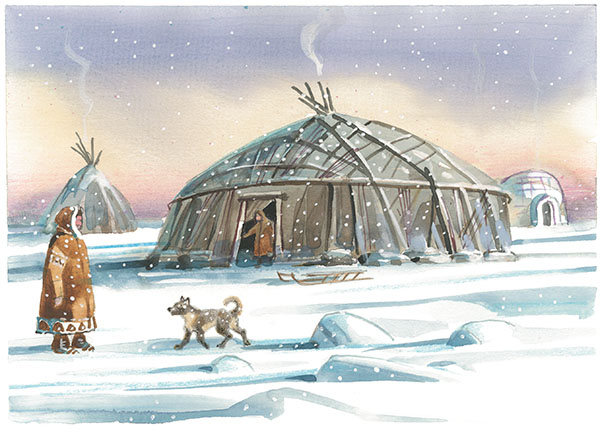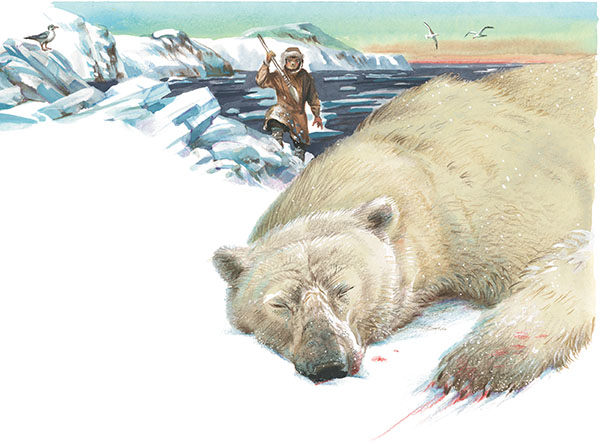 – Вы, мужчины, возьмите собак и нарты и ступайте по моему следу, – сказал он. – За день пути отсюда найдёте много мяса на льду – медведицу и двух медвежат.