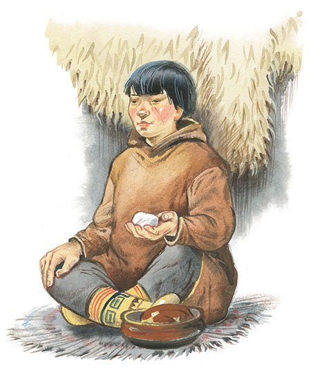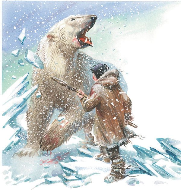 – Вот так, – сказал он. – Надо взять маленький кусочек тюленьего жира и сделать в нём ямку – вот так. Потом в ямку надо положить китовый ус – вот так, и, хорошенько его свернув, закрыть его сверху другим кусочком жира. Потом это надо выставить на мороз, и когда жир замёрзнет, получится маленький круглый шарик. Медведь проглотит шарик, жир растопится, острый китовый ус распрямится – медведю станет больно. А когда медведю станет очень больно, его легко убить копьём. Это совсем просто.