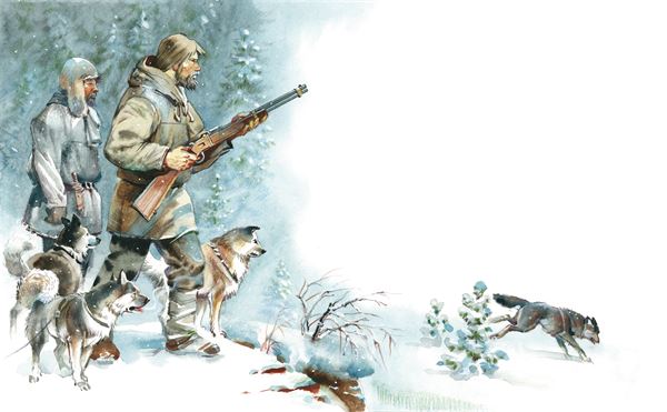 Билл оглянулся и спокойно остановил собак. За поворотом, который они только что прошли, по их свежим следам бежал поджарый пушистый зверь. Принюхиваясь к снегу, он бежал лёгкой, скользящей рысцой. Когда люди остановились, остановился и он, вытянув морду и втягивая вздрагивающими ноздрями доносившиеся до него запахи.