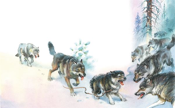 Но Одноухий припустил ещё быстрее, волоча по снегу постромки. А там, на только что пройденном ими пути, его поджидала волчица. Подбегая к ней, Одноухий навострил уши, перешёл на лёгкий мелкий шаг, потом остановился. Он глядел на неё внимательно, недоверчиво, но с жадностью. А она скалила зубы, как будто улыбаясь ему вкрадчивой улыбкой, потом сделала несколько игривых прыжков и остановилась. Одноухий пошёл к ней всё ещё с опаской, задрав хвост, навострив уши и высоко подняв голову.