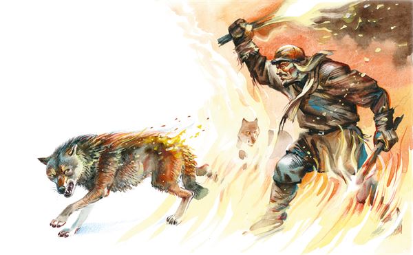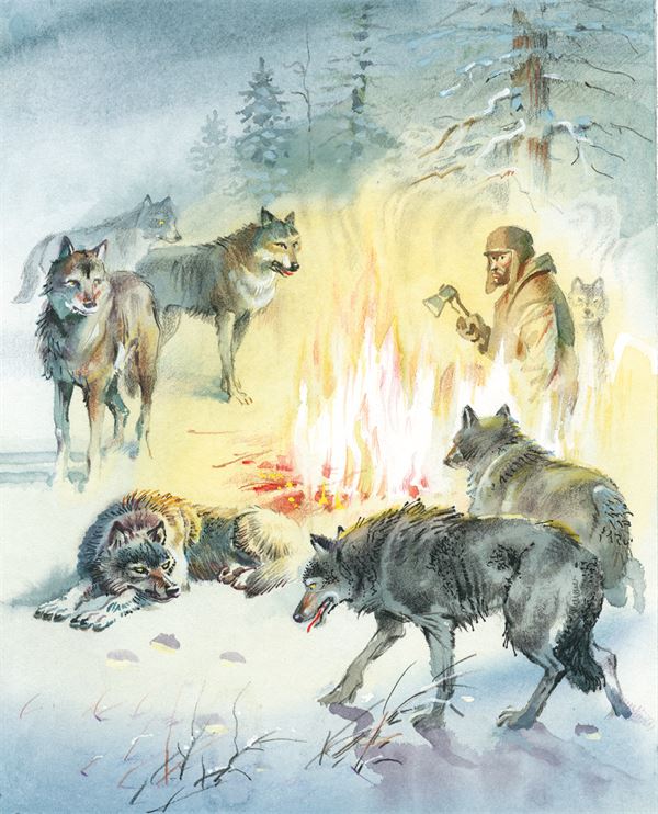 Стало светать, потом наступил день. Костёр догорал, хворост подходил к концу, надо было пополнить запас. Человек попытался выйти за пределы огненного кольца, но волки кинулись ему навстречу. Горящие головни заставляли их отскакивать в стороны, но назад они уже не убегали. Тщетно старался человек прогнать их. Убедившись наконец в безнадёжности своих попыток, он отступил внутрь горящего кольца, и в это время один из волков прыгнул на него, но промахнулся и всеми четырьмя лапами угодил в огонь. Зверь взвыл от страха, огрызнулся и отполз от костра, стараясь остудить на снегу обожжённые лапы.