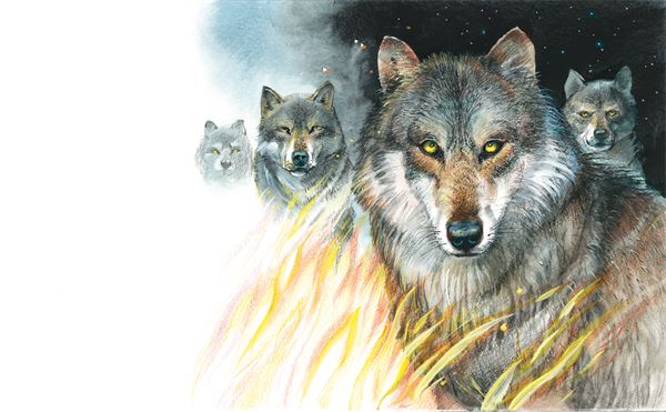 Проснувшись, он увидел между двумя кострами прямо перед собой волчицу, смотревшую на него пристальным взглядом.