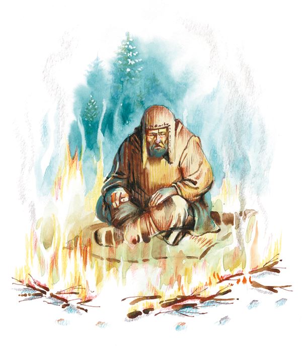 А потом он проснулся и услышал вой и рычание уже наяву. Волки всей стаей бросились на него. Чьи-то клыки впились ему в руку. Он прыгнул в костёр и, прыгая, почувствовал, как острые зубы полоснули его по ноге. И вот началась битва. Толстые рукавицы защищали его руки от огня, он полными горстями расшвыривал во все стороны горящие угли, и костёр стал под конец чем-то вроде вулкана.