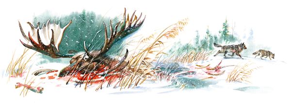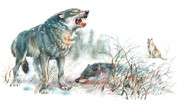 Волкам пришлось пересечь не один водораздел и обрыскать не один ручей в низинах, прежде чем поиски их увенчались успехом. Они встретили лосей. Первой их добычей был крупный лось-самец. Это была жизнь. Это было мясо, и его не защищали ни таинственный костёр, ни летающие головни. С раздвоенными копытами и ветвистыми рогами волкам приходилось встречаться не впервые, и они отбросили своё обычное терпение и осторожность. Битва была короткой и жаркой. Лося окружили со всех сторон. Меткими ударами тяжёлых копыт он распарывал волкам животы, пробивал черепа, громадными рогами ломал им кости. Лось подминал их под себя, катаясь по снегу, но он был обречён на гибель, и в конце концов ноги у него подломились. Волчица с остервенением впилась ему в горло, а зубы остальных волков рвали его на части – живьём, не дожидаясь, пока он затихнет и перестанет отбиваться.