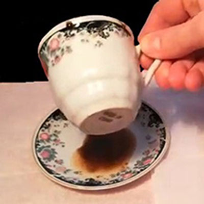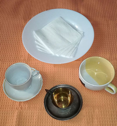 Остаток содержимого чашки перемешивается тремя круговыми движениями, как бы размазывая содержимое по внутренней поверхности чашки. Далее жидкость выливается в блюдце вращательным движением кисти руки.