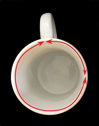 Смотреть нужно от ручки и по часовой стрелке. Если при питье кофе чашечка была в правой руке, то чашка берется в правую руку. Если чашечка была в левой руке, то берёте чашечку в левую руку. Словом, как выпивался кофе.