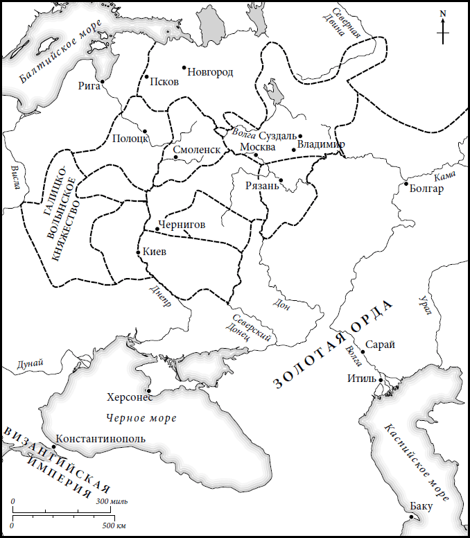 В 1223 году войска Киевской Руси при поддержке кочевников-половцев (тюркского племени, родственного печенегам и поселившегося в Северном Причерноморье и на Волге на их месте) вступили в бой с монгольской армией на реке Калке на территории современной Донецкой области на востоке Украины[99]. Монголы разбили союзные войска и казнили многих русских князей. Однако монголы решили не идти дальше и вернулись в Среднюю Азию. В 1232 году они вернулись, напали на город Болгар, «поплениша и покориша многу Нижнюю землю Болгорскую и грады разориша»[100]. Через четыре года они вторглись вновь – на сей раз с войском, размер которого оценивается по-разному: от 25 до 140 тысяч человек. Под предводительством Батыя, внука Чингисхана, они завоевали Волжскую Булгарию и остались там. Болгар был взят в 1236 году, а Биляр и Сувар были разграблены. После этого войско Батыя обратило взгляд на города древнерусских княжеств: Рязань разграбили в 1237 году, Владимир (столицу Владимиро-Суздальского княжества) сожгли дотла в 1238-м; Киев взяли штурмом и уничтожили в 1240-м. Разграбили и все города Верхнего Поволжья: Городец, Кострому, Нижний Новгород, Ярославль, Углич и Тверь. Москва, в то время небольшой городок во Владимиро-Суздальском княжестве, была разграблена в 1238 году.