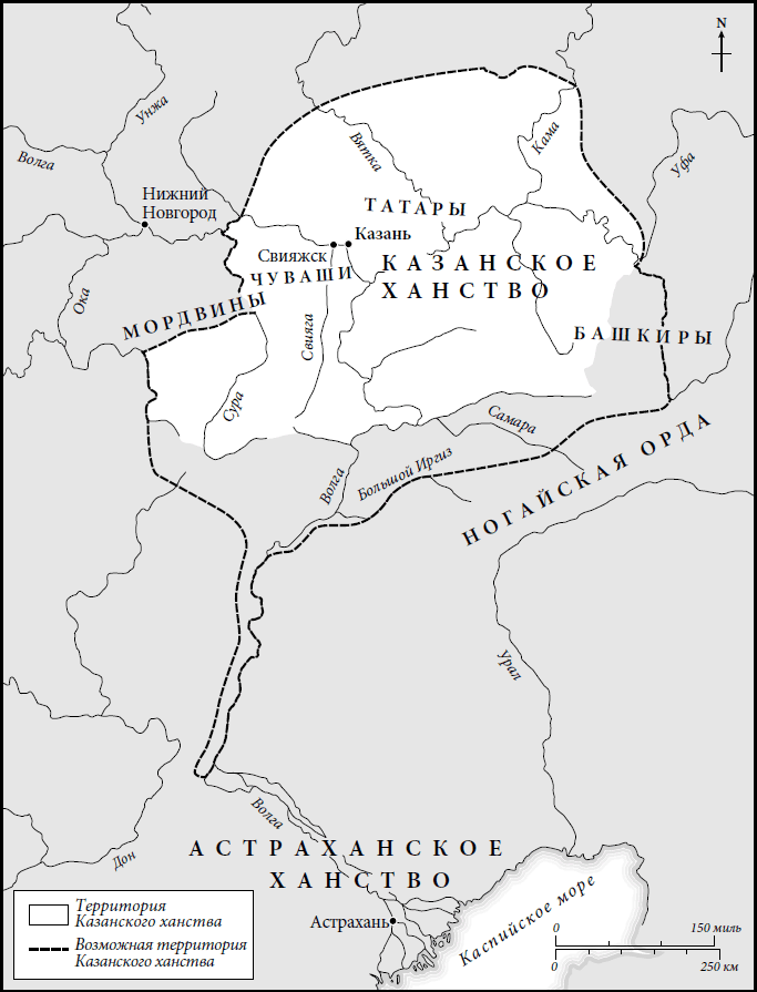 Сначала Казанское ханство продолжало политику Золотой Орды и постоянно совершало набеги на русские княжества. Казанцы несколько раз приходили на русские земли, вынуждая князей платить им дань. В 1439 году казанский хан[132] захватил Нижний Новгород и пошел на Москву. В 1444–1445 годах хан в битве у Суздаля взял в плен Василия II, великого князя владимирского, и заставил заплатить большой выкуп[133]. Однако с 1470-х годов Казанское ханство стало клониться к упадку, раздираемое внутренними сварами членов ханской семьи. К этому времени на сцену вышло новое русское государство – Московское княжество (иногда называемое Великим княжеством Московским или просто Московией)[134].
