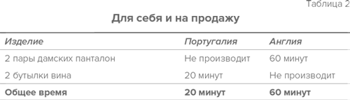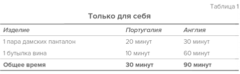 Будьте внимательны – сейчас мы объясним вам, почему обмен товарами приносит большую выгоду. Для начала посмотрите (таблица 1), сколько времени (гипотетически) уходит у Англии и Португалии на то, чтобы изготовить одну бутылку вина и один предмет одежды (дамские панталоны), когда каждая страна делает это только для себя и не участвует в торговле.