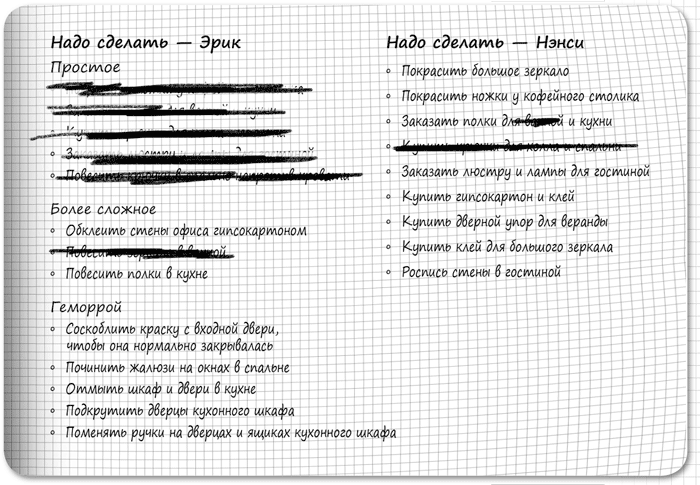 На двери в кухню они повесили два списка дел, по списку на каждого, и часто проверяли по ним друг друга – чтобы никто не смухлевал.