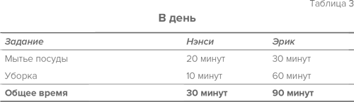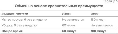 Если каждый из них специализируется только на одной задаче, Нэнси будет убирать в доме все шесть дней в неделю, а Эрик соответственно будет мыть посуду. И схема получится вот такая (таблица 5):