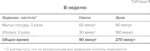 Таким образом, Нэнси сэкономит себе в неделю 30 минут, а Эрик – 90. С точки зрения их прежнего понятия о «равноправии», эту новую систему нельзя назвать «справедливой» – ведь чисто формально Эрику приходится работать больше, чем его жене. Но разве их старая система, при которой Эрик возился с этими делами три лишних часа, была «справедливее»? Эрик и Нэнси считали свое прежнее разделение труда удачным лишь потому, что оно не позволяло взвалить всю домашнюю работу на кого-то одного. Хотя при этом оно лишало их драгоценных месяцев жизни.