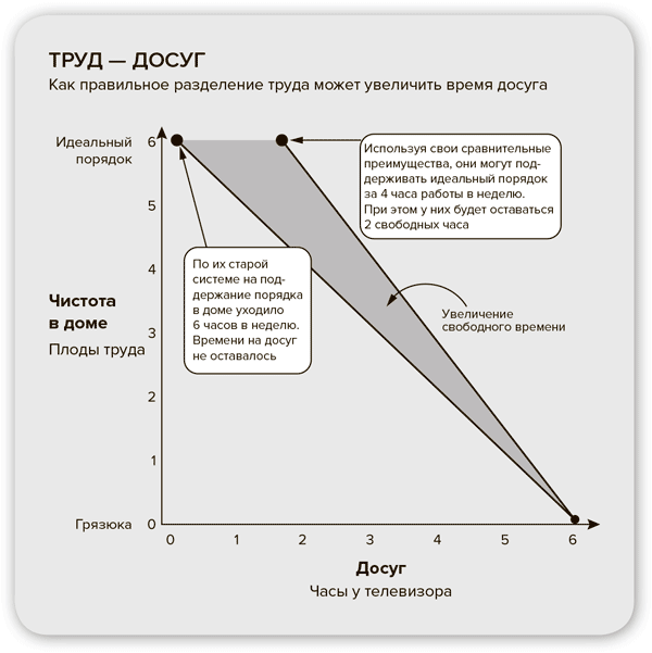 Но если бы они решили распределить дела, основываясь на сравнительных преимуществах, у них в доме царил бы идеальный порядок и при этом у них бы оставалось два часа на телевизор.