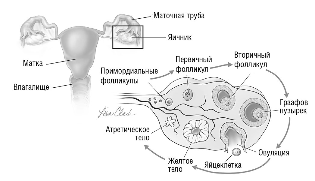 После 20-й недели беременности миллионы примордиальных фолликулов начинают исчезать: этот процесс называется атрезией. Атрезия продолжается после рождения до полового созревания, к моменту которого в яичниках остается приблизительно 300 тысяч примордиальных фолликулов. Представьте себе посев семян в цветочный горшок. При хороших условиях ростков будет гораздо больше, чем может вместить небольшой горшок. Необходимо удалять наименее здоровые ростки, чтобы добиться правильного соотношения ростков и почвы и дать здоровым росткам оптимальные шансы на выживание.