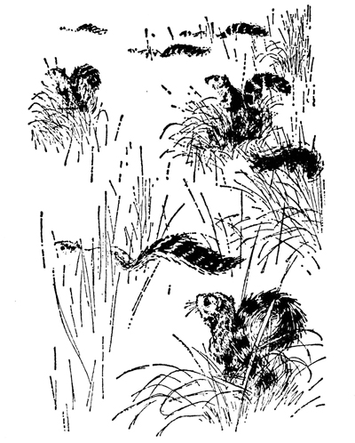 Я отер с лица росу и начал вглядываться в гущу трав, где мы расставили сети. Вскоре откуда-то из глубины леса донеслось еще «чак! чак!». Это проснулись и другие белки и подозрительным взглядом встречали наступающий день. Мы ждали, как нам показалось, ужасно долго, и вдруг я увидел, что на лугу между нами и сетями что-то движется – что-то очень странное. На первый взгляд это можно было принять за овальный черно-белый полосатый мяч, который опять и опять подскакивал над высокой травой. В туманной утренней дымке я никак не мог понять, что же это такое, и молча ткнул пальцем, указывая охотникам на движущийся мяч.