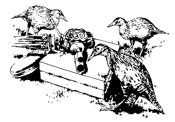 Осмотрев аппаратуру, уэки приступили к исследованию нашей одежды и обуви. Они легонько тюкали нас клювом по ногам и невозмутимо расхаживали между нами, причем ни на минуту не переставали трещать. Чем-то это походило на чревовещание: стоя подле ваших ног, уэка вдруг начинал стучать, вы даже видели, как он это делает, а звук доносился откуда-то со стороны. Что до невозмутимости, то ее им хватало ненадолго. Стоило бросить на землю горсть крошек, как начиналась постыдная свалка, уэки беззастенчиво отталкивали друг друга и сердито перебранивались.