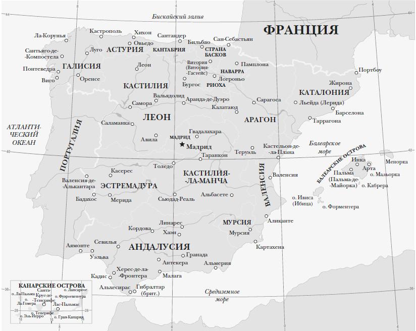 Испания – это не только Пиренейский полуостров. Это еще и острова, Балеарские и Канарские, и анклавы в Марокко – Сеута и Мелилья, эдакий аналог Гибралтара (Гибралтар – территория на юге Испании, которой с 1704 года управляла Британия). Впрочем, власти Испании никогда не считали статусы этих территорий равнозначными. Все остальные владения Испанской империи исчезли, хотя когда-то, если судить по ее размерам и мировому значению, это была величайшая держава в мире.