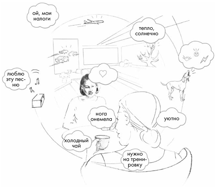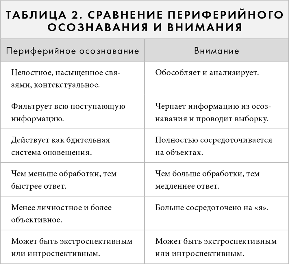 Периферийное осознавание работает совсем по-другому. Оно не выделяет какой-либо один объект для анализа, а задействует общее осознавание всего, что воспринимают наши органы чувств. Периферийное осознавание лишь в малой степени связано с концептуальными процессами ума, оно открыто, всеобъемлюще и целостно. То есть оно занимается тем, как объекты соотносятся друг с другом и остальным миром. Периферийное осознавание позволяет нам реагировать более эффективно, предоставляя информацию о предыстории и контексте наших переживаний: где мы находимся, что происходит вокруг нас, что мы делаем и почему (например, мы не принимаем веревку за змею, так как находимся зимой на Аляске).