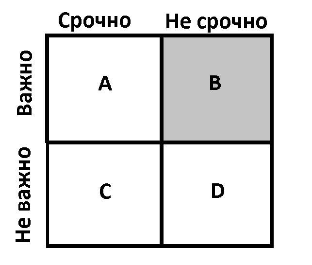 Квадрат А – это важные и срочные задачи. Их приходится решать в первую очередь. Однако следует следить за тем, чтобы этот квадрат был пустым большую часть времени. Большое количество важных и срочных дел приводит к авралу. Аврал – это плохо. Если ты много времени проводишь за тушением пожара, то у тебя нет времени возделывать твой сад. К задачам из этого квадрата можно отнести все задачи с близким дедлайном. Тебе завтра нужно сдавать проект, а он еще совсем не готов? Ты весь день посвятишь этому проекту, потому что это задача из квадрата А. Тебе нужно подготовить и отправить важные документы сегодня до 18.00? Торопись – это задача из квадрата А. Завтра твоему ребенку нужно идти в школу, а у него нет ручек, карандашей и тетрадей? Тебе срочно нужно идти в магазин – ты в квадрате А.