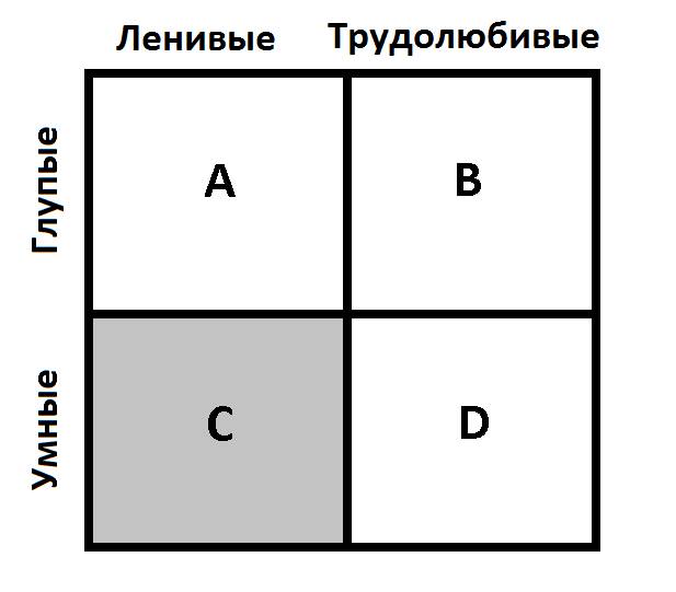 Квадрат C – умные, но ленивые офицеры. Это «золото» армии. Именно этих людей нужно назначать на самые ответственные позиции, потому что они будут делать только необходимое и не станут без причины заставлять работать своих подчиненных. Благодаря этим офицерам выигрываются войны.